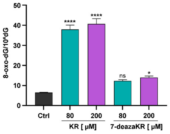 Quantitative analysis of 8-oxo-dG content in T98G cells by HPLC-UV-ED after treatment with KR and 7-deazaKR. The number of 8-oxo-dG residues per 1 × 106 base pairs in DNA was calculated in cells after 24 h incubation with KR and 7-deazaKR (80 and 200 µM). Control cells were cultured in fully supplemented growth medium alone. Statistical significance is indicated with asterisks: (ns) p > 0.05, * p < 0.05, **** p < 0.0001.