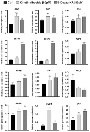 Lastly, we analyzed the changes in the gene expression levels of several enzymes related to oxidative stress and cellular welfare indicators in the presence of KR and 7-deazaKR (Table 2; Figure 9). We found that both KR and 7-deazaKR activated enzymatic scavengers involved in the antioxidant defense (SOD, CAT, and GSS) at similar levels. After treatment with both compounds, we observed an increase in the expression levels, which might be related to the protection against excessively formed ROS. The most significant change was observed for superoxide dismutase (SOD), which was correlated with an increase in the expression to approximately more than threefold change as compared to that for control cells (Figure 9). However, we noted that 7-deazaKR had a greater effect on genes related to oxidative stress, such as SESN1, SESN2, NRF2, and NFKB, and it significantly increased the expression level of these genes as compared to that noted for KR. The expression level of SESN2 remained unchanged after treatment with KR. We also observed that both derivatives decreased the expression level of critical regulator of mitochondrial energy metabolism, PGC-1a, which in turn caused the activation of other genes belonging to the group of the cellular welfare indicators (SIRT2, PARP1, TNFA, and p53) (Figure 9). KR showed a greater influence on the expression level of TNFA, which was more than a fivefold change as compared to that for control cells (Figure 9).