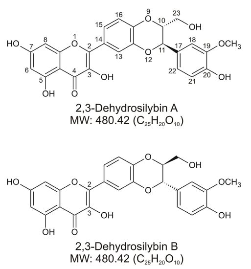 Chemical structures of 2,3-dehydrosilybin A and 2,3-dehydrosilybin B.