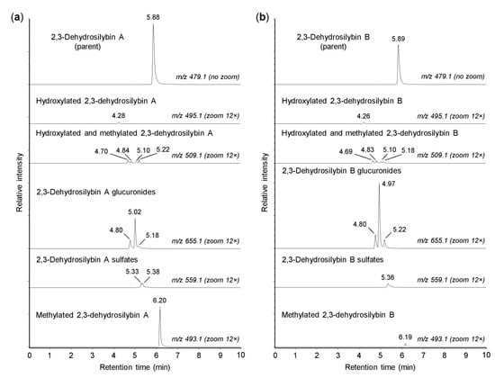 As shown in Figure 2, both 2,3-dehydrosilybin A and 2,3-dehydrosilybin B (m/z 479.0974) were transformed into one monohydroxylated metabolite (m/z 495.0921) and four metabolites generated by hydroxylation and methylation (m/z 509.1084). The formation of hydroxylated products confirmed that cytochromes P450 might play a role in the biotransformation of 2,3-dehydrosilybin enantiomers [16]. Moreover, the parent molecules of 2,3-dehydrosilybin A and B bear five hydroxyl groups, so they were also metabolized by conjugation reactions without prior oxidative modifications. We found that 2,3-dehydrosilybin A and B were each converted to three monoglucuronides (m/z 655.1287), one or two monosulfates (m/z 559.0513), and one monomethyl derivative (m/z 493.1132) (Figure 2). The monoglucuronides were the most abundant metabolites overall, while the other metabolite species were formed only to a lesser extent (Table 1). The retention times of all biotransformation products, except the methyl derivatives, were lower than the retention times of the parent compounds (Figure 2).