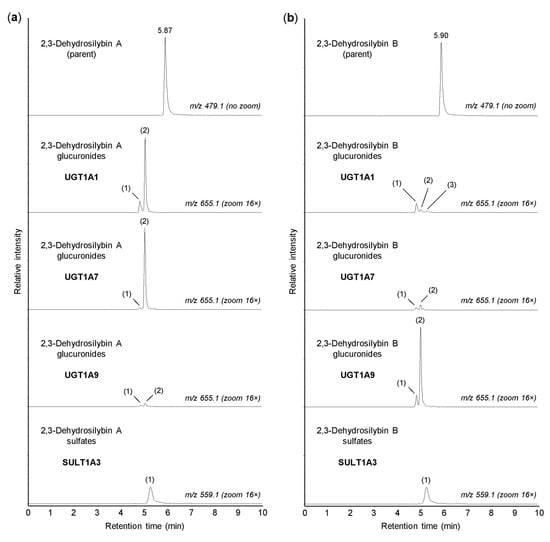 Glucuronidation and sulfation of 2,3-dehydrosilybin A and B by recombinant human enzymes. Human UGT1A1, UGT1A7, UGT1A9, and SULT1A3 were incubated for 30 min with 50 µM 2,3-dehydrosilybin A (panel a) or 2,3-dehydrosilybin B (panel b), and the biotransformation products were analyzed by UHPLC-MS. The peaks of glucuronides and sulfates are marked with numbers (in brackets) corresponding to those in Table 2 and Table 3. The signal intensity in chromatograms was adjusted to the same value before using the zoom tool.