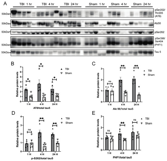 A single blast overpressure (BOP) caused increased tau phosphorylation in the mouse brain. (A) Representative Western blots demonstrated the early elevation of phospho-tau (Ser202/Thr205 detected by AT8, pS262, and Ser396/Ser404 detected by PHF1 antibody and pathological conformation changes of tau (Alz50) in the cortex after blast (n = 5/group). Tau-5 was probed to detect total tau. (B–E) Quantification analysis of AT8 (B), Alz50 (C), pS262 (D), and PHF1 (E) normalized to total tau detected b they tau 5 antibody. (Data are means ± SEM, * p < 0.05, ** p < 0.01; ns, non-significant). TBI: traumatic brain injury.