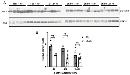 BOP caused the activation of extracellular signal-regulated kinase (ERK) in the mouse brain. Representative Western blots (A) and quantification analysis (B) revealed the activation of ERK after blast (n = 5/group). (Data are means ± SEM, * p < 0.05, ** p < 0.01; ns, non-significant).