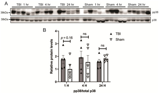 BOP caused a trend toward the activation of p38 in the mouse brain. Representative Western blots (A) and quantification analysis (B) revealed the activation of p38 after blast (n = 5/group). (Data are means ± SEM; ns, non-significant).