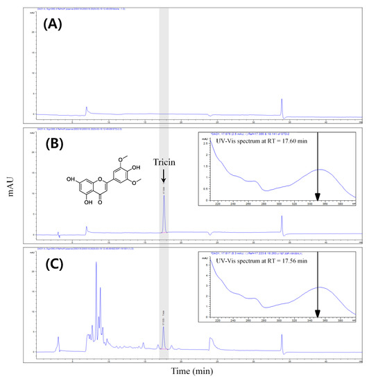 - Lee, S.-S.; Baek, Y.-S.; Eun, C.-S.; Yu, M.-H.; Baek, N.-I.; Chung, D.-k.; Bang, M.-H.; Yang, S.-A. Tricin derivatives as anti-inflammatory and anti-allergic constituents from the aerial part of Zizania latifolia. Biosci. Biotechnol. Biochem. 2015, 79, 700–706. [Google Scholar] [CrossRef] [PubMed]