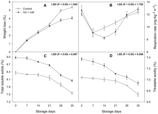 The effect of oxalic acid (OA) treatments in (A) weight loss (%), (B) respiration rate (mg kg−1 h−1), (C) total soluble solids (mg 100 g−1), and (D) titrable acidity (mg 100 g−1) during 35 days of storage at 10 °C in the 2020 experiment. Data are the mean ± SE. LSD show significant differences at p < 0.05.