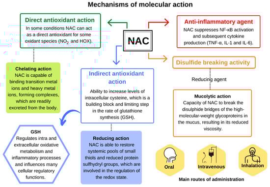 Mechanism of molecular action of N-acetylcysteine. Adapted from Aldini et al. (2018) [].