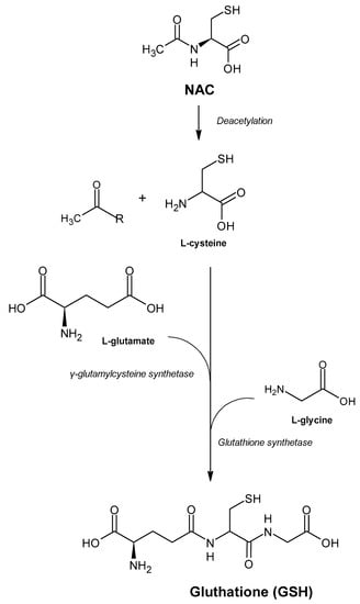 The importance of NAC as a potent antioxidant is directly linked to its ability to increase levels of intracellular cysteine with subsequent increase in GSH (Figure 2). The isolated uses of both GSH and cysteine were not effective in raising GSH levels within cells, making NAC one of the major strategies to reduce the damage caused by oxidative stress in cases of xenobiotic intoxication, such as paracetamol or in pathologies related to GSH deficiency, through the maintenance of their levels in different tissues [,,].