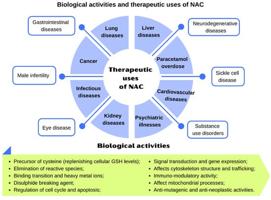 Animal studies have shown that NAC exerts a potent protective effect against oxidative stress and inflammation under different conditions, including improvement of brain damage induced by transient cerebral ischemia [], pain and inflammation management in case of infection [], and restoration of thyroid morphology via reduced infiltration of inflammatory cells []. Although several in vivo and ex vivo studies have shown that NAC plays important biological actions that can potentially support its putative therapeutic roles, its effectiveness in clinical studies in addressing different pathological conditions still has conflicting results [,]. Thus, the purpose of this review is to provide an overview of the medical effects and applications of NAC to human health based on current therapeutic evidence.