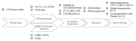 WB technological transformation in value-added products must include stabilization methods to guarantee their stability. Several studies have pointed out the instability of phenolic compounds to temperature, light, humidity, and oxygen [27,28]. Spray-drying (SPD) could be a suitable process to stabilize WB bioprocessing downstream products into a solid powder. This technology is simple, relatively inexpensive, rapid, and, thus, widely used in industry. However, some disadvantages have been also reported including the loss of a significant amount of product and the possibility of degradation of sensitive products at high drying temperatures. The extent of these changes depends on the intensity of the SPD process [29,30], which can be optimized by adjusting operating conditions. Additionally, SPD can be used as microencapsulation (MEC) technique with the incorporation of encapsulating agents (e.g., plant proteins isolates) in the process, affecting positively to the stability of microparticles, the process efficiency, and the degree of protection of bioactive compounds [31]. Therefore, the aim of the present work was to gain insight into the effect of a multistep process combining HT and HHP, and a further step of enzymatic hydrolysis using different organic acids and SPD and MEC for stabilization of WB hydrolysates rich on FA with antioxidant and immunomodulatory properties.