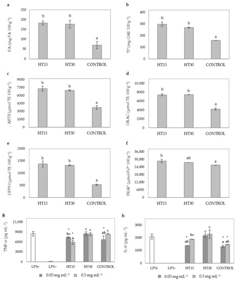 Evaluation of time during HT on phenolic compounds content, TAC and AIA of WB hydrolysates. (a) FA content (mg 100 g−1); (b) TP content (mg GAE 100 g−1); (c) ABTS scavenging activity (µmol TE 100 g−1); (d) ORAC (µmol TE 100 g−1); (e) DPPH scavenging activity (µmol TE 100 g−1); (f) FRAP (µmol Fe2+ 100 g−1); (g) TNF-α levels (pg mL−1); (h) IL-6 levels (pg mL−1). Sample identification: hydrolyzed WB without HT (CONTROL), hydrothermal treatment for 15 min (HT15), hydrothermal treatment for 30 min (HT30). Different lowercase letters show significant differences between different experimental groups (one-way ANOVA, post hoc Duncan’s test, p ≤ 0.05). * denote significant differences between mean values of cell treatments and untreated LPS+ cells (one-way ANOVA, post hoc Duncan’s test, p ≤ 0.05). Abbreviations: 2,2′-azino-bis (3-ethylbenzothiazoline-6-sulfonic acid) (ABTS); 2,2-diphenyl-1-picryl-hydrazyl-hydrate (DPPH); ferulic acid (FA); ferric reducing antioxidant power (FRAP); gallic acid equivalents (GAE); interleukin-6 (IL-6); lipopolysaccharide (LPS); oxygen radical absorbance capacity (ORAC); Trolox equivalents (TE); total phenolics (TP); tumor necrosis factor-alpha (TNF-α).