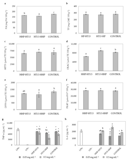 Evaluation of the sequential use of HT and HHP on phenolic compounds content, TAC and AIA of WB hydrolysates. (a) FA content (mg 100 g−1); (b) TP content (mg GAE 100 g−1); (c) ABTS scavenging activity (µmol TE 100 g−1); (d) ORAC (µmol TE 100 g−1); (e) DPPH scavenging activity (µmol TE 100 g−1); (f) FRAP (µmol Fe2+ 100 g−1); (g) TNF-α levels (pg mL−1); (h) IL-6 levels (pg mL−1). Sample identification: hydrothermal treatment for 15 min (CONTROL), HHP followed by HT for 15 min (HHP-HT15), and HT for 15 min followed by HHP (HT15-HHP). Different lowercase letters show significant differences between different treatment groups (one-way ANOVA, post hoc Duncan’s test, p ≤ 0.05). * denotes significant differences between mean values of cell treatments and untreated LPS+ cells (one-way ANOVA, post hoc Duncan’s test, p ≤ 0.05). Abbreviations: 2,2′-azino-bis (3-ethylbenzothiazoline-6-sulfonic acid) (ABTS); 2,2-diphenyl-1-picryl-hydrazyl-hydrate (DPPH); ferulic acid (FA); ferric reducing antioxidant power (FRAP); gallic acid equivalents (GAE); interleukin-6 (IL-6); lipopolysaccharide (LPS); oxygen radical absorbance capacity (ORAC); Trolox equivalents (TE); total phenolics (TP); tumor necrosis factor-alpha (TNF-α).