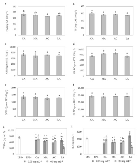 Effect of the type of organic acid used during WB hydrolysis by Ultraflo XL in optimal conditions (47 °C, pH 5, 20 h) on phenolic compounds content, TAC and AIA of WB hydrolysates. (a) FA content (mg 100 g−1); (b) TP content (mg GAE 100 g−1); (c) ABTS scavenging activity (µmol TE 100 g−1); (d) ORAC (µmol TE 100 g−1); (e) DPPH scavenging activity (µmol TE 100 g−1); (f) FRAP (µmol Fe2+ 100 g−1); (g) TNF-α concentration (pg mL−1); (h) IL-6 concentration (pg mL−1). In these experiments HT15 was used as a pretreatment. Sample identification: WB hydrolyzed in the presence of citric acid (CA), malic acid (MA), acetic acid (AC), and lactic acid (LA). Different lowercase letters show significant differences between samples (one-way ANOVA, post hoc Duncan’s test, p ≤ 0.05). * denotes significant differences between mean values of treatment groups and LPS+ cells (one-way ANOVA, post hoc Duncan’s test, p ≤ 0.05). Abbreviations: 2,2′-azino-bis (3-ethylbenzothiazoline-6-sulfonic acid) (ABTS); 2,2-diphenyl-1-picryl-hydrazyl-hydrate (DPPH); ferulic acid (FA); ferric reducing antioxidant power (FRAP); gallic acid equivalents (GAE); interleukin-6 (IL-6); lipopolysaccharide (LPS); oxygen radical absorbance capacity (ORAC); Trolox equivalents (TE); total phenolic content (TP); tumor necrosis factor-alpha (TNF α).