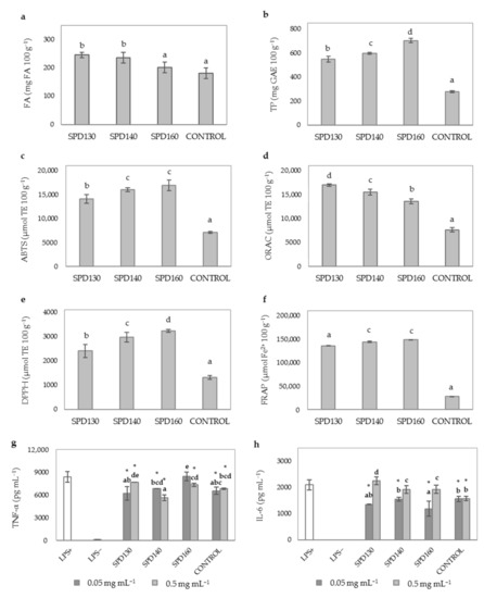 Evaluation of the SPD inlet temperature on phenolic compounds content, TAC and AIA of WB hydrolysates. (a) FA content (mg 100 g−1); (b) TP content (mg GAE 100 g−1); (c) ABTS scavenging activity (µmol TE 100 g−1); (d) ORAC (µmol TE 100 g-1); (e) DPPH scavenging activity (µmol TE 100 g-1); (f) FRAP (µmol Fe2+ 100 g-1); (g) TNF-α levels (pg mL−1); (h) IL-6 levels (pg mL−1). Sample identification: hydrolyzed WB treated at HT15 (CONTROL), hydrolyzed WB spray-dried at 130 °C (SPD130), 140 °C (SPD140), or 160 °C (SPD160). Different lowercase letters show significant differences between samples (one-way ANOVA, post hoc Duncan’s test, p ≤ 0.05). * indicates significant differences for mean values relative to treated cells (LPS+) (one-way ANOVA, post hoc Duncan’s test, p ≤ 0.05). Abbreviations: Abbreviations: 2,2′-azino-bis (3-ethylbenzothiazoline-6-sulfonic acid) (ABTS); 2,2-diphenyl-1-picryl-hydrazyl-hydrate (DPPH); ferulic acid (FA); ferric reducing antioxidant power (FRAP); gallic acid equivalents (GAE); interleukin-6 (IL-6); lipopolysaccharide (LPS); oxygen radical absorbance capacity (ORAC); Trolox equivalents (TE); total phenolics (TP); tumor necrosis factor-alpha (TNF-α).