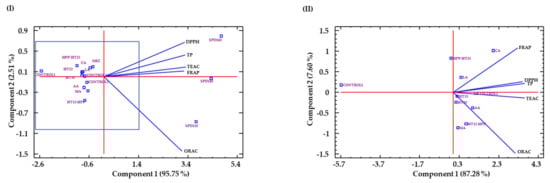 Biplots of (I) PCA analysis of antioxidant results of hydrolyzed WB and (II) PCA analysis of the samples within the inner rectangle, i.e., excluding SPD samples. Sample identification: hydrolyzed WB without hydrothermal treatment (CONTROL), with hydrothermal treatment for 15 min (HT15), with hydrothermal treatment for 30 min (HT30), with hydrothermal treatment for 15 min and HHP (HT15-HHP), with HHP and hydrothermal treatment for 15 min (HHP-HT15), treated with citric acid (CA), malic acid (MA), acetic acid (AC), lactic acid (LA), spray-dried at 130 °C (SPD130), 140 °C (SPD140), 160 °C (SPD160), and microencapsulated with Pisane C9 at 130 °C (MEC). Abbreviations: 2,2′-azino-bis (3-ethylbenzothiazoline-6-sulfonic acid) (ABTS); 2,2-diphenyl-1-picryl-hydrazyl-hydrate (DPPH); ferric reducing antioxidant power (FRAP); oxygen radical absorbance capacity (ORAC); total phenolics (TP).