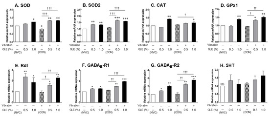 Effects of GLE (green lettuce leaf extract) on (A) SOD, (B) SOD2, (C) CAT, (D) GstD1, (E) Rdl, (F) GABAB-R1, (G) GABAB-R2, and (H) 5HT mRNA expression by vibration stress in fruit flies. Fly heads were collected after 12 h/12 h cycles for two weeks. Experimental groups include the no-vibration-stress control group (NVC), control group (CON, stress-induced vibration), and GLE (green lettuce leaf extract)-treated groups with or without stress (0.5 and 1.0%). Values are presented as the mean ± standard error of the mean (SEM) for each group, n = 150. * p < 0.05, ** p < 0.01, and *** p < 0.001 when compared with the NVC group. † p < 0.05, †† p < 0.01, and ††† p < 0.001 when compared with the CON group (ANOVA followed by post-hoc Tukey’s test). NS, not significant.