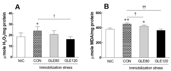 Effects of GLE (green lettuce leaf extract) on (A) hydrogen peroxide and (B) malondialdehyde by immobilization stress in rats. Experimental groups include the no-immobilization-stress control group (NIC), control group (CON, stress-induced immobilization), and GLE (green lettuce leaf extract)-treated groups with stress (80 and 120 mg/kg). Values are presented as the mean ± standard error of the mean (SEM) for each group, n = 8. * p < 0.05 and ** p < 0.01 when compared with the NIC group. † p < 0.05 and †† p < 0.01 when compared with the CON group (ANOVA followed by post-hoc Tukey’s test).