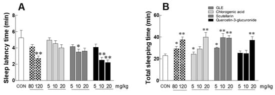 Effects of GLE (green lettuce leaf extract), chlorogenic acid, scutellarin, and quercetin-3-glucuronide (Q3G) on (A) sleep latency time and (B) total sleep time in mice that received a hypnotic dose of pentobarbital (42 mg/kg, i.p.). Experimental groups include the control group (CON), GLE (green lettuce leaf extract)-treated groups (80 and 120 mg/kg), chlorogenic acid, scutellarin, and Q3G-treated groups (5, 10, and 20 mg/kg). Values are presented as the mean ± standard error of the mean (SEM) for each group, n = 7. * p < 0.05 and ** p < 0.01 when compared with the CON group (ANOVA followed by post-hoc Tukey’s test).