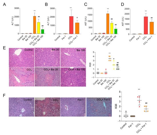 Effects of baicalein and Fer-1 supplementation on CCl4-induced liver dysfunction and histopathology. Levels of serum (A,B) ALT and (C,D) AST (n = 6). (E,F) Representative histopathological images of hematoxylin and eosin (H&E) stained liver sections and their semi-quantitative scoring (SQS (n = 4)). Magnification, ×20. All results are presented as mean ± SD. ** p < 0.01, compared to the untreated control group, respectively; # p < 0.05 or ## p < 0.01 compared to the CCl4 only group. Bai, baicalein. Fer-1, ferrostatin-1.