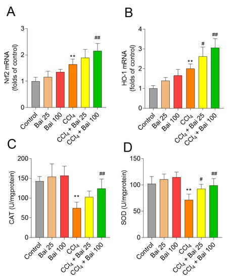 As shown in Figure 5, at 24 h, CCl4 exposure per se up-regulated the expression of Nrf2 and HO-1 mRNAs compared to that in the control group (1.6- and 2.0-fold, respectively; both p < 0.01) (Figure 5A,B). Baicalein supplementation, particularly at 100 mg/kg/day, further up-regulated the expressions of Nrf2 and HO-1 mRNAs (all p < 0.01), compared to that in the CCl4 only group. Moreover, baicalein supplementation at the doses of 25 and 100 mg/kg/day for 7 consecutive days, significantly up-regulated the activities of antioxidant enzymes SOD and CAT in the liver tissues, compared to the CCl4-only group (Figure 5C,D).