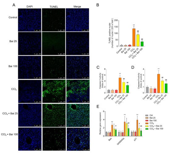 Effects of baicalein supplementation on apoptotic pathway in the liver tissues of mice challenged with CCl4. (A) Representative TUNEL-stained sections showing apoptosis in the liver tissue of mice. (B) Quantitative analysis of TUNEL positive rates (n = 4). (C,D) Activities of (C) caspases-3 and -9 (D) (n = 6). (E) The relative expression of Bax, GADD45a and p21 mRNAs in the liver tissues (n = 5). ** p < 0.01, compared to the control group; # p < 0.05 or ## p < 0.01, compared to the CCl4 only group. Bar = 100 μm. Bai: baicalein.