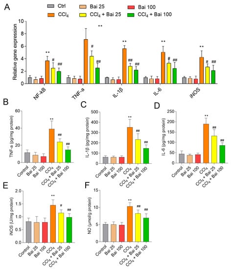 Effects of baicalein supplementation on CCl4 -induced inflammation in the liver tissues of mice. (A) The relative expression levels of NF-κB, TNF-a, IL-1β, IL-6, and iNOS mRNAs; (B) levels of IL-1β protein; (C) levels of IL-6 protein; (D) levels of TNF-a protein; (E) levels of iNOS protein; (F) levels of NO. All data are presented as mean ± SD (n = 6). ** p < 0.01, compared to the control group; # p < 0.05 or ## p < 0.01, compared to the CCl4 only group. Bai: baicalein.