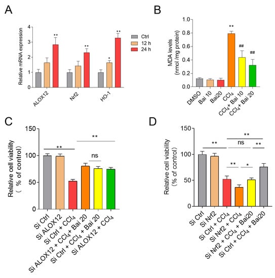Effect of ALOX12 and Nrf2 genes knockdown on the protective effect of baicalein in HepG2 cells. (A) The expression of ALOX12, Nrf2, and HO-1 mRNAs were examined after 0.4% CCl4 treatment for 12 h and 24 h in HepG2 cells. Data are presented as mean ± SD (n = 3). * p < 0.05, ** p < 0.01, compared to the control group. (B) Effect of baicalein supplementation on levels of MDA in HepG2 cells. Knockdown of ALOX12 (C) or Nrf2 (D) on the protective effect of baicalein on CCl4 (0.4%) treatment (for 24 h) -induced cell death. SiRNA#1s targeting ALOX12 and Nrf2 gene were used here, respectively. All data are presented as mean ± SD (n = 3). * p < 0.05, ** p < 0.01, compared to the SiCtrl group. ## p < 0.01, compared to the CCl4 alone group. Ctrl: control. ns: no significance.