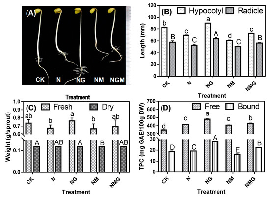 Effects of γ-aminobutyric acid (GABA) treatment on morphological status (A), length (B), weight (C), and phenolics content (D) of soybean sprouts under NaCl stress (n = 3). CK indicates distilled water treatment, N indicates 40 mM NaCl treatment, NG indicates 40 mM NaCl + 5 mM GABA treatment, NM indicates 40 mM NaCl + 0.2 mM 3-MP treatment, and NGM indicates 40 mM NaCl + 0.2 mM 3-MP + 5 mM GABA treatment. Error bars represent the standard deviation. Values in the same measured category bearing different uppercase letters (A–E) or lowercase letters (a–d) are significantly different (p < 0.05).