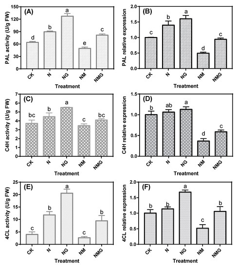 Effects of GABA treatment on phenylalanine ammonia lyase (PAL; A), cinnamic acid 4-hydroxylase (C4H; C), 4-coumarate coenzyme A ligase (4CL; E) activity and their mRNA levels (B,D,F) in soybean sprouts under NaCl stress (n = 3). CK, N, NG, NM, and NMG indicate distilled water treatment, 40 mM NaCl treatment, 40 mM NaCl + 5 mM GABA treatment, 40 mM NaCl + 0.2 mM 3-MP treatment, and 40 mM NaCl + 0.2 mM 3-MP + 5 mM GABA treatment, respectively. Error bars represent standard deviation. Values in the same measured category bearing different letters (a–e) are significantly different (p < 0.05).