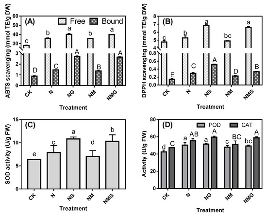 Effects of GABA treatment on 2,2’-azinobis (3-ethylbenzthiazoline-6-sulphonic acid) (ABTS; A) and1,1-Diphenyl-2-picrylhydrazyl radical 2,2-Diphenyl-1-(2,4,6-trinitrophenyl) hydrazyl (DPPH; B) Super oxide dimutese (SOD; C), CAT, and peroxidase (POD; D) activity in soybean sprouts under NaCl stress. CK, N, NG, NM, and NMG indicate distilled water treatment, 40 mM NaCl treatment, 40 mM NaCl + 5 mM GABA treatment, 40 mM NaCl + 0.2 mM 3-MP treatment, and 40 mM NaCl + 0.2 mM 3-MP + 5 mM GABA treatment, respectively. Error bars represent standard deviation. Values in the same measured category bearing different uppercase letters (A–E) or lowercase letters (a–e) are significantly different (p < 0.05).