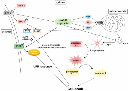 Mechanistic analyses of α-crystallin mediated cytoprotection. Abbreviation list: cyt c, cytochrome c; Apaf1, apoptotic protease activating factor 1; eIF-2α, eukaryotic translation initiation factor 2α; ATF4, activating transcription factor 4; CHOP, C/EBP homologous protein; XBP1, X-box binding protein; IRE1, Inositol requiring enzyme 1; PERK, Protein kinase R-like ER kinase; ER, endoplasmic reticulum; UPR, unfolded protein response.