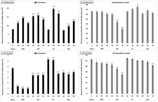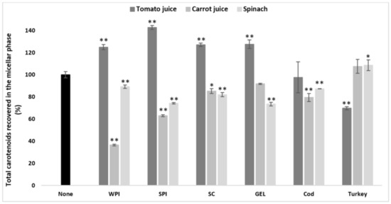 Under control conditions (no added proteins), the overall bioaccessibility of carotenoids (all carotenoids combined) differed significantly between the food matrices (p < 0.001, Table S1). Following in vitro GI digestion, overall carotenoid micellization was higher from spinach (19.0 ± 0.4%) than from carrot juice (12.1 ± 0.3%) and tomato juice (2.3 ± 0.3%).