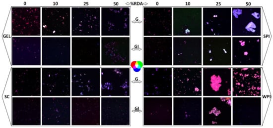 Results from our previous investigations demonstrated that whey protein isolate (WPI) was able to modulate β-carotene bioaccessibility during in vitro GI digestion, improving its bioaccessibility when the amount of co-digested dietary lipids is limited. However, a negative effect was observed under insufficient digestion parameters (i.e., limited concentrations of digestive enzymes and bile), likely via interactions during the processing of lipid droplets into mixed micelles by limiting the extent of lipolysis, therefore hindering carotenoid transfer [33]. Similarly, a study by Goupy et al. showed that the transfer of pure carotenoids to oil droplets was dramatically impaired when the emulsions were stabilized by bovine serum albumin [34]. In addition, we have reported in a recent study that various proteins (WPI, SPI, SC and gelatin (GEL)) had both positive and negative effects on the bioaccessibility of isolated carotenoids (β-carotene, lycopene and lutein) [35]. These influences depended not only on the type of carotenoids, where higher polarity was reflected in a higher degree of micellization, but also on the type and concentration of proteins where their digestibility and hydrophobicity were related to their emulsifying properties.