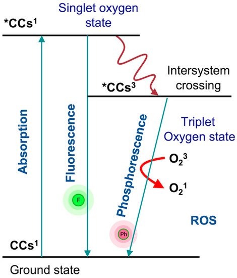 Diagrammatic representation of the electronic energy of the physical events supplementing the absorption of photon by cosmetic chemicals (CCs): CCs1, ground state; *CCs1, excited singlet state; *CCs3, excited triplet state; O23, triplet (ground) state oxygen; O21, singlet (excited) state oxygen.