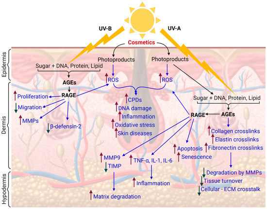 Schematic representation showing the effects of UV-induced cosmetics photosensitization, advanced glycation end (AGE) products, and receptor for AGEs (RAGE) on the human skin. UV-B can penetrate the epidermis, while UV-A can penetrate deeper in the dermis and induce the biomolecules to form AGE that may influence several targets in the skin through receptor- and nonreceptor-facilitated pathways (created with BioRender.com).
