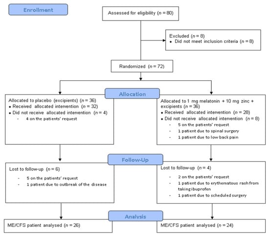 In total, 80 eligible ME/CFS patients were screened, of whom eight were excluded from the study because they did not meet the inclusion criteria. The remaining 72 participants were randomized by an independent investigator not otherwise involved in the intervention, using the table of random numbers in the Milton statistical guide []; they were allocated in a double-blind fashion with a 1:1 ratio either to the experimental group (Mel-Zinc, n = 36) or matching placebo (n = 36).