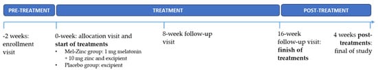The fast-release formulation tested contained a homogenized mixture of 1 mg of melatonin, which was manufactured through an organic synthesis process using as primary starting product 5-methoxytryptamine by Flamma group, Italy, and 10 mg of zinc (zinc sulphate 1-hydrate of synthetic origin by Quality Chemicals, Barcelona, Spain), including isomaltose, and magnesium stearate as excipient based on local E.U. regulations (see information at https://www.efsa.europa.eu/es/efsajournal/pub/2241, accessed on 21 April 2021). The matching placebo capsules were made of the excipient only. The mixture was encapsulated in a purple gelatin capsule. Each bottle contained enough capsules for four months of consumption (120 capsules/bottle); posology consisted of one capsule once a day at night (30 min before bedtime) for 16 weeks. The fast-release preparations (experimental and placebo capsules) were identical in size, shape, color, opacity and taste, and also in terms of presentation and packaging to avoid differentiation by the participants or the research staff. The study pharmacist recorded all treatments supplied on the medication-dispensing forms along with the original script. Both treatments were provided by Laboratorios Viñas, S.A. (www.vinas.es, Barcelona, Spain, accessed on 21 April 2021).