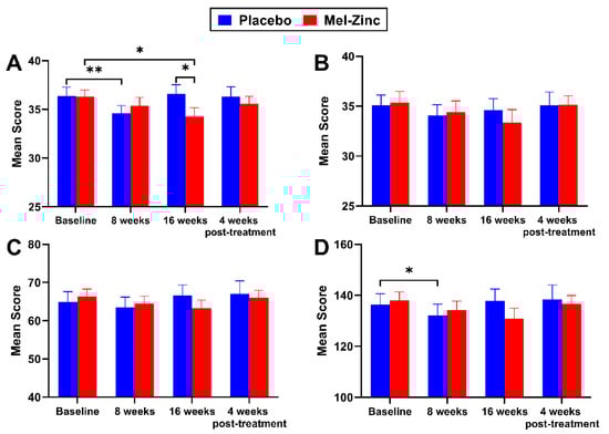 Changes in the FIS-40 domain scores during the intervention study. Each bar indicates the mean FIS-40 item scores ± SEM compared by a paired Student’s t-test, where appropriate, for intragroup analysis and by a Wilcoxon’s signed rank test for intergroup analysis. (A) Physical functioning domain; (B) Cognitive domain; (C) Psychological domain; (D) Total FIS-40 score. The significance threshold was set at * p < 0.05 and ** p < 0.01. No significant differences in any FIS-40 domain scores were observed between the intervention groups in the rest of study visits. Lower scores indicate an improvement in the fatigue perception among participants. Abbreviations: Mel-Zinc, Melatonin plus Zinc group; FIS-40, 40-item fatigue index scale.