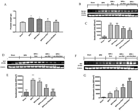 Effect of um-PEA/Baic on cell growth and apoptotic pathway. Prostate weight (A); Western blots and densitometric analysis of TGF-β (B,C), Bcl-2 (D,E) and BAX (F,G). A demonstrative blot of lysates with a densitometric analysis for all animals is shown. Values shown are means ± SEM of six animals in each group. * p < 0.05 vs. sham; ** p < 0.01 vs. sham; *** p < 0.001 vs. sham; # p < 0.05 vs. BPH group; ## p < 0.01 vs. BPH group; ### p < 0.001 vs. BPH group.