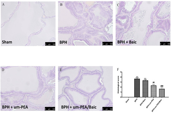 Effect of um-PEA/Baic on prostate morphology. Histological evaluation of the prostate: sham (A); BPH (B); BPH + Baic (C); BPH + um-PEA (D); BPH + um-PEA/Baic (E); histological score (F). Images are indicative of at least 3 independent experiments. Values shown are means ± SEM of six animals in each group. A 20X magnification is shown (100-µm scale bar). *** p < 0.001 vs. sham; ## p < 0.01 vs. BPH group; ### p < 0.001 vs. BPH group.