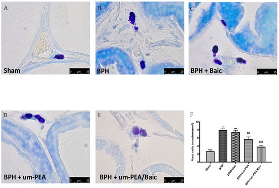 Toluidine blue staining was used to visualize the mast cell infiltration in the stromal cells of all the experimental groups. BPH resulted in an increased number of mast cells (Figure 4B,F) when compared to the control group (Figure 4A,F). The um-PEA group showed lower mast cell infiltration (Figure 4D,F) when compared to the BPH group, although the infiltration was higher when compared to that in the um-PEA/Baic group (Figure 4E,F). Baic treatment did not reduce the number of activated mast cells (Figure 4C,F).