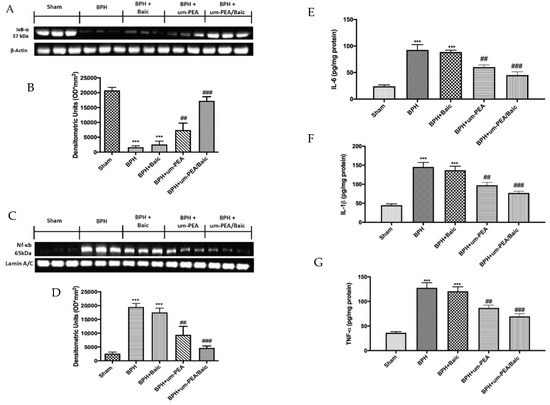 Effect of um-PEA/Baic on inflammation pathway. Western blots and densitometric analysis of IκB-α (A,B) and NF-κB (C,D). IL-6 (E), IL-1β (F) and TNF-α (G) levels. A demonstrative blot of lysates with a densitometric analysis for all animals is shown. Values shown are means ± SEM of six animals in each group. *** p < 0.001 vs. sham; ## p < 0.01 vs. BPH group; ### p < 0.001 vs. BPH group.