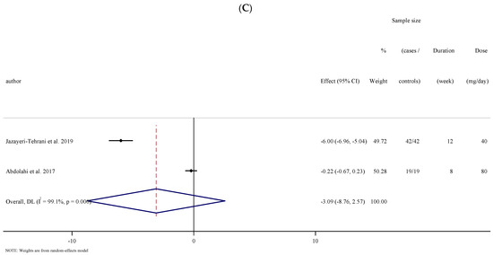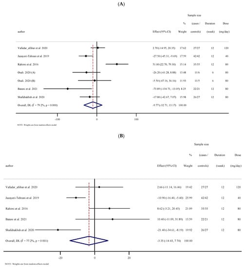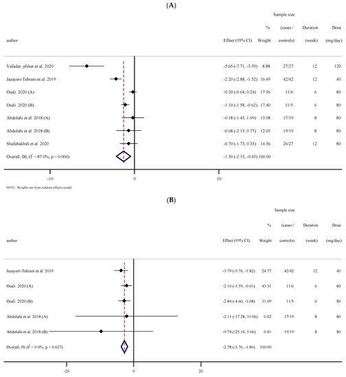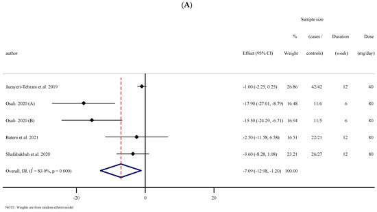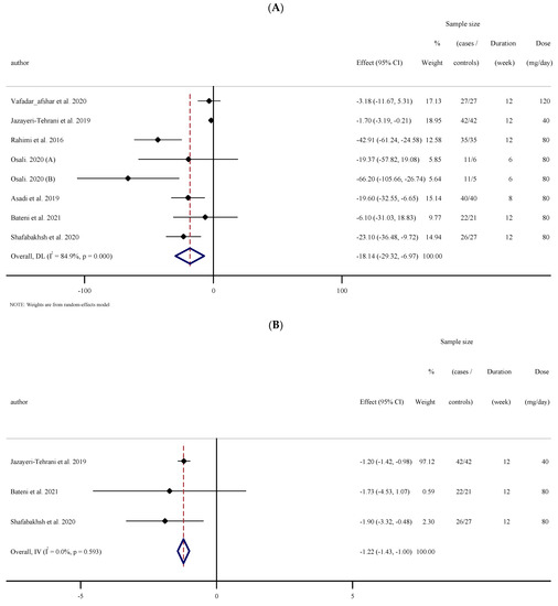 The outcomes analysis of the seven studies with eight effect sizes that measured FBS concentrations subsequent to nano-curcumin supplementation (210 cases and 200 controls) indicated an overall effect of a significant reduction in FBS concentrations ((WMD: −18.14 mg/dL; 95% CI: −29.31 to −6.97; p = 0.001, I2 = 84.9%, p < 0.001); (Figure 2A)). Subgroup analyses established significant changes when baseline FBS was <100 or ≥100 (mg/dL), trial duration was <12 and ≥12 weeks, and in type 2 diabetic and overweight individuals (25–29.9 kg·m−2) (Table 2).