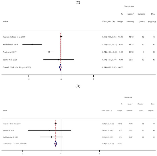 Overall results from five RCTs (152 cases and 152 controls), did not reveal significant alterations in LDL cholesterol concentrations (WMD: −3.59 mg/dL; 95% CI: −15.74 to 8.56; p = 0.562), with high between-study heterogeneity ((I2 = 84.8%, p < 0.001); (Figure 1C)). Subgroup analyses demonstrated nano-curcumin supplementation significantly altered LDL-C in participants with baseline LDL-C ≥ 100 (mg/dL) and BMI > 30 kg·m−2 (Table 2).