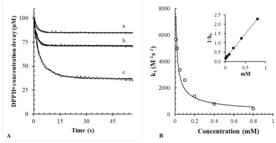(A) Best fitting model for sinapic acid at different concentrations vs. 100 µM DPPH• employing Equation (1). a: 10; b: 20; c: 50 µM. (B) Observed rate constants versus concentration; the solid line represents the potential equation. The inset represents the linear trend of concentrations vs. 1/k1 (R2 = 0.999).