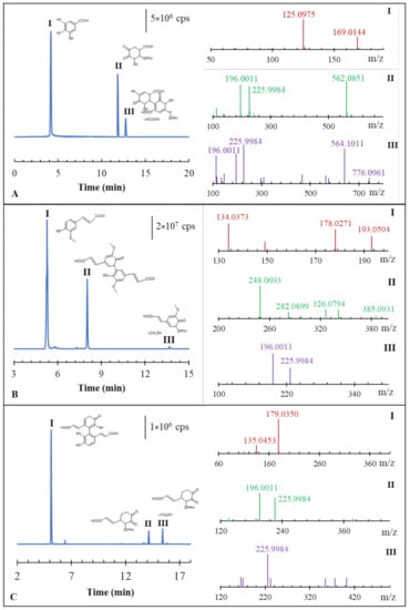 Extracted ion chromatographic peaks with the corresponding proposed molecular formulas for gallic (A), ferulic (B) and caffeic acid (C) after the reaction with DPPH•. On the right, the dd-MS2 spectra presenting the characteristic fragment ions are reported.