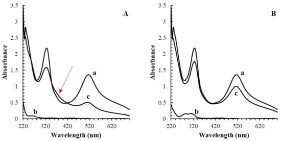 Comparison of the absorbance scans of 100 µM DPPH• (a), 10 µM antioxidant (b) and the mixture (c) after 2 min reaction in gallic (A) and ferulic acid (B). The atypical absorbance trend for the reaction of gallic acid and DPPH• between 350 and 400 nm was explained by the presence of potential reaction products.