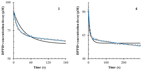 Fitting of the kinetic data for Moringa oleifera (1) and Harpagophytum procubens (4). The black solid line represents the fitting in the model without the side reaction, and the blue line represents the fitting in the model with the side reaction. The “x” points represent the data points for the recorded concentration decay of 100 µM DPPH•.
