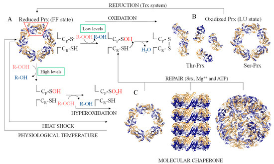 A remarkable feature of 2-Cys Prx is the structural rearrangement that are triggered by CP oxidation. Reduced 2-Cys Prx enzymes (CP-S−) are stabilized as decamers [(α2)5] and can assume the so called fully folded (FF) state (Figure 1A), in which CP is located in the first turn of an α-helix near to N-terminal region of the protein and far away from CR (10–16 Å), which is located in the C-terminus of these enzymes. Upon oxidation, partial unfolding of the α-helix containing CP-SOH (the so-called locally unfolded = LU state) allows its approximation to CR with the consequent intermolecular disulfide bond formation [37]. In the disulfide form, the 2-Cys Prx decamers tend to dissociate into low molecular weight (LMW) species, mainly dimers [38,39,40] (Figure 1B). Moreover, when CP is hyperoxidized or when subjected to heat shock, 2-Cys Prx can switch from decamers to higher molecular weight (HMW) species [32,33,35,41,42] (Figure 1C). Therefore, two reversible structural switches (FF–LU and decamers dissociation) are inter-connected and the stabilities of distinct conformers are influenced by thermal and/or redox factors.