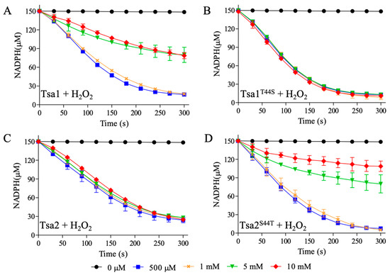 Tsa1, Tsa2, and mutant inhibition by H2O2. S. cerevisiae Tsa1 (A), Tsa1T44S (B), Tsa2 (C), or Tsa2S44T (D) were exposed to increasing amounts of H2O2. The assays were performed with 1 µM Prx, 2 µM Trx1, 0.3 µM TrxR1, and increased amounts of H2O2 (0 µM = ● black, 500 µM = ■ blue, 1 mM = × orange, 5 mM = ▼ green and 10 mM = ♦ red) in buffer containing 50 mM HEPES pH 7.4, 100 μM DTPA, 1 mM sodium azide and 150 µM NADPH. The decrease in NADPH absorbance was followed at 340 nm. The error bars represent the standard deviation. All the experiments were performed in triplicate and repeated at least three times with similar results.